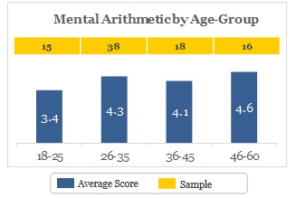 Older respondents (especially in the age bracket of 46-60 years) outscored younger ones. The question on long division was a bit complex in nature and involved some application of estimation. A direct relationship was observed among the percentage of people answering it correctly and their age-group, i.e. a high percentage of people in the higher age-group answered the question correctly.