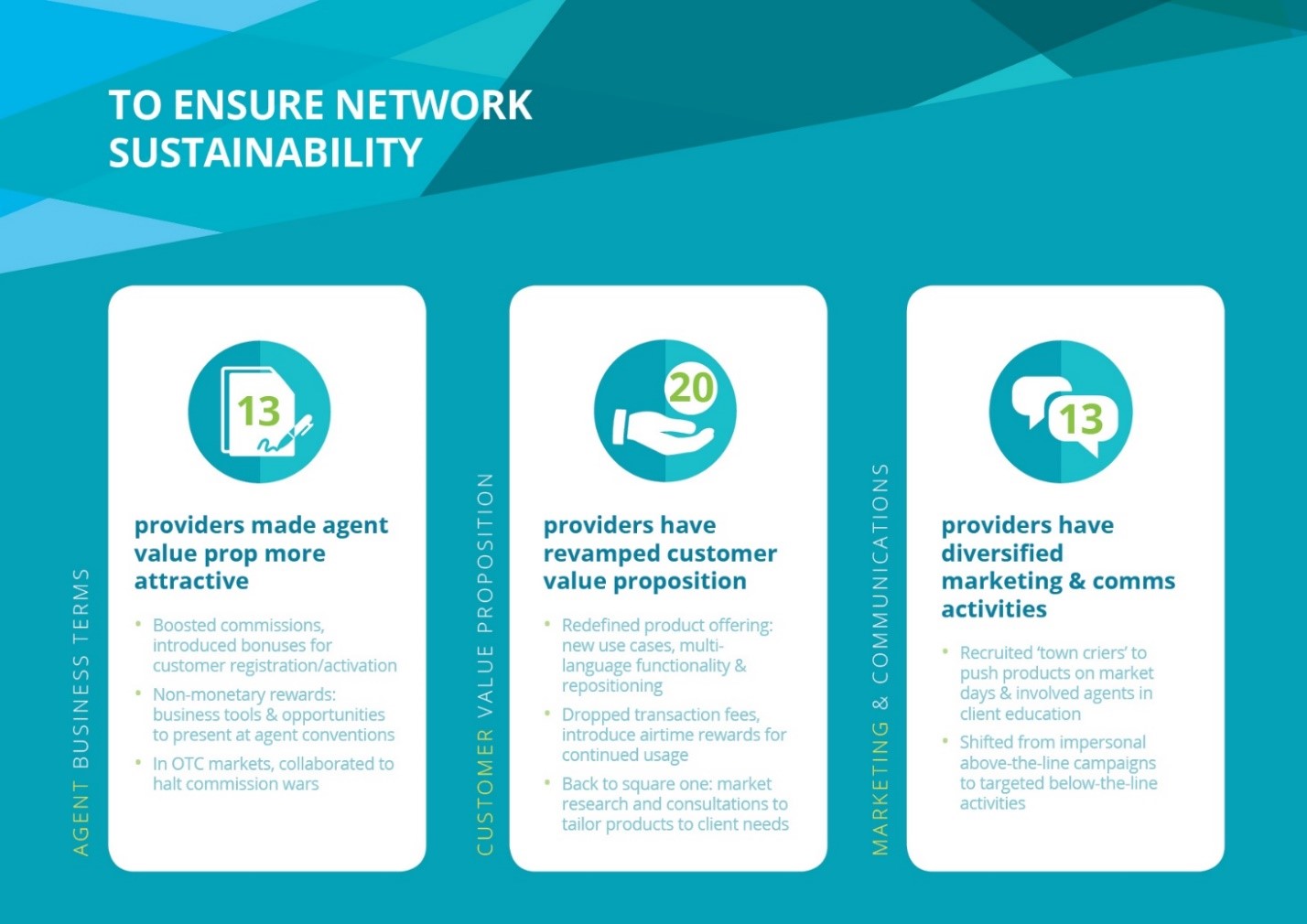 Minimise Network Downtime: Connectivity in most developing countries has proved a major hurdle in the deployment of agent networks. Some providers have therefore chosen to locate their agents only in areas where there are masts to ensure that agents can carry out transactions and reduce inactivity. Other providers have initiated system upgrades based on recommendations from peers.