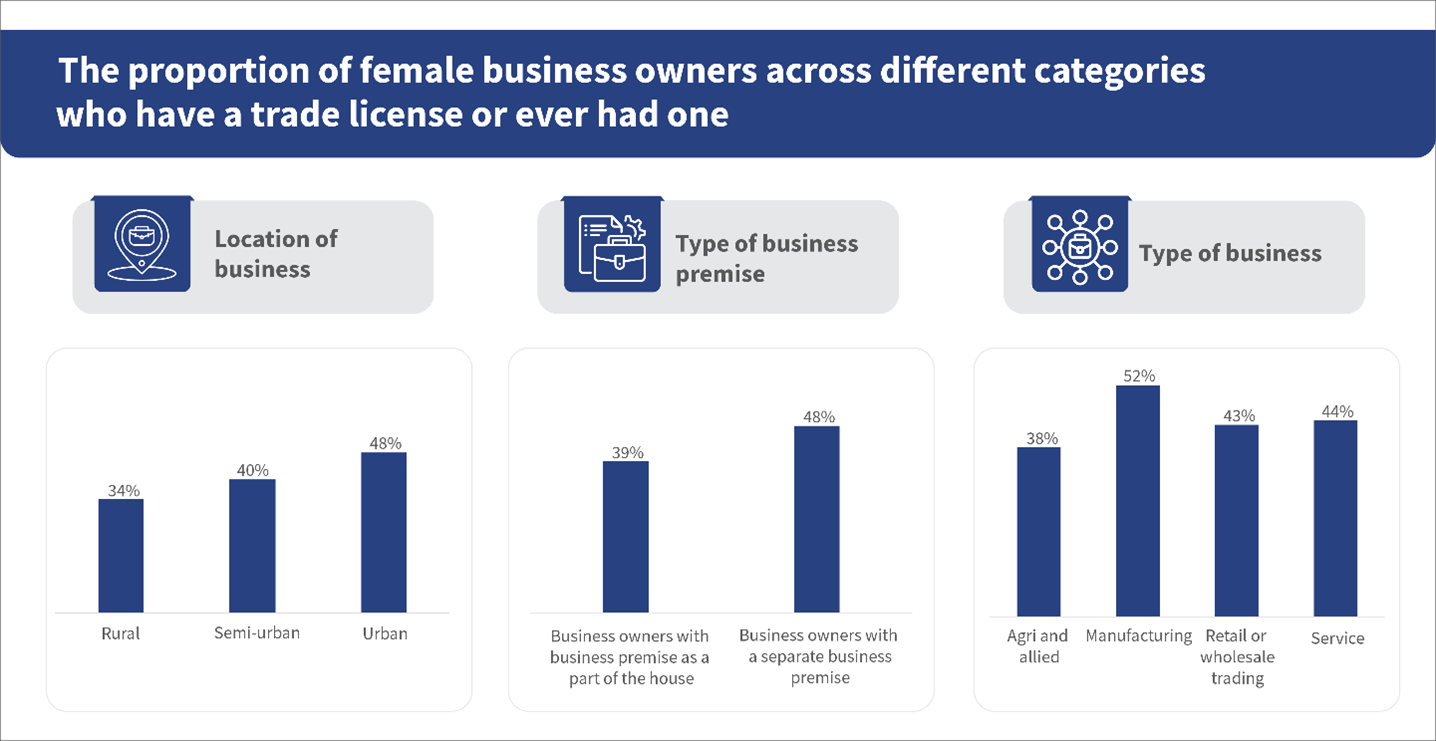 We conducted a comprehensive study of CMSMEs through the Women Business Diaries project, supported by the Bill & Melinda Gates Foundation. This research identified several demand- and supply-side barriers that hinder women’s access to formal credit. Among these, the lack of a trade license was a significant obstacle for women entrepreneurs. Only 48% of entrepreneurs from our sample of 413 female and 76 male entrepreneurs had ever possessed a trade license. However, this proportion varies significantly between male and female entrepreneurs, as male entrepreneurs are more likely to have a trade license (p=0.000).