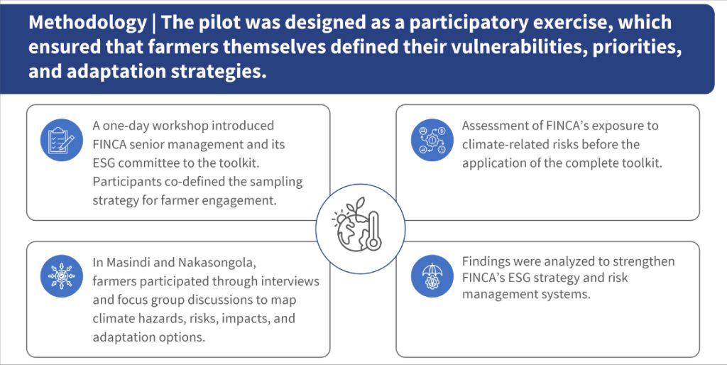 Against this backdrop, MSC partnered with FINCA Uganda to pilot its LLA-IFSP Toolkit. The exercise exposed material climate risks in FINCA’s portfolio, which clarified client adaptation needs, and generated product concepts that aligned with seasonal cash flows. It highlighted climate change as a risk to manage and an opportunity to expand the customer base. This approach could improve portfolio quality, de-risk existing lending, and place climate risk at the core of the ESG strategy.