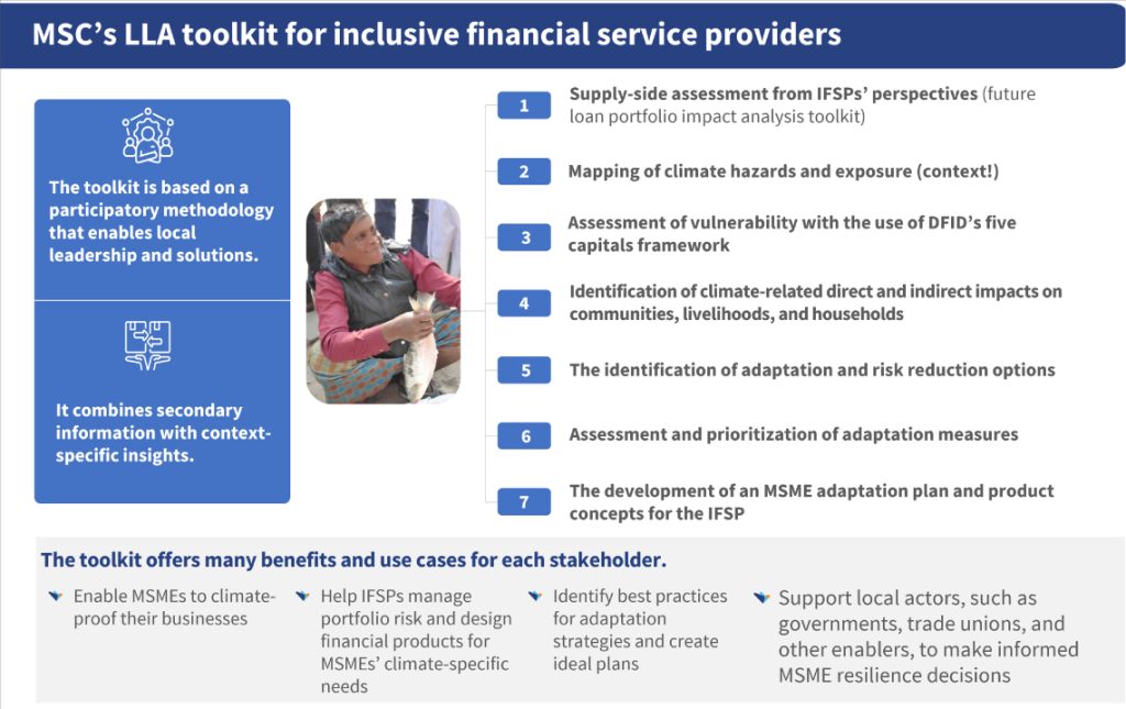 MSC’s LLA toolkit for IFSPs (LLA-IFSP toolkit) is built for this tier. It enables lenders to trace climate impact pathways across household journeys, from hazards and vulnerabilities to impacts on livelihoods and supply chains that include inputs and outputs. Lenders can adjust product structures and translate MSME insights into phased, financeable plans.