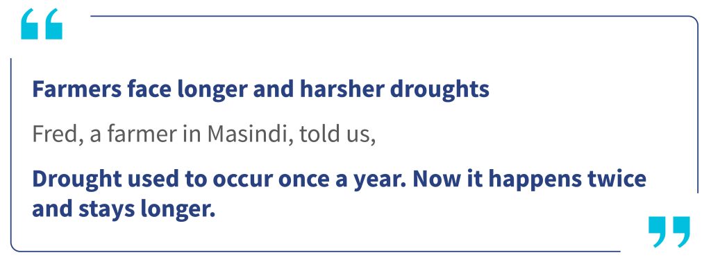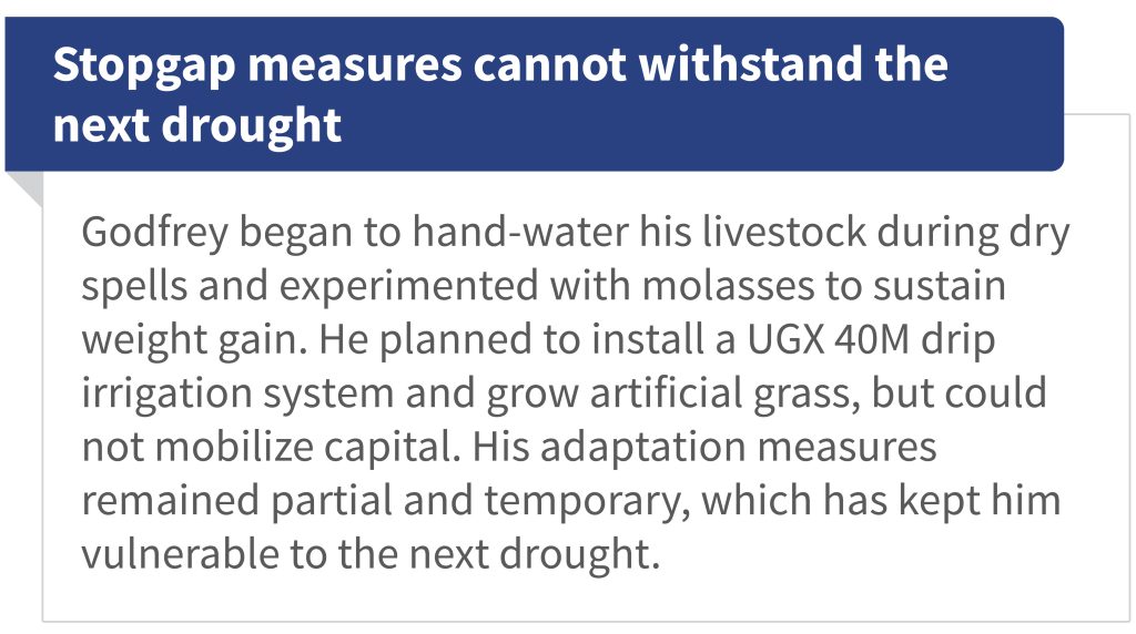 Godfrey is not alone. Uganda’s MSMEs and farmers form the but struggle with the growing impacts of climate change. Droughts are now more frequent and prolonged, which disrupts rain-fed farming and pastoral systems. The 2010–2011 drought alone led to losses worth USD 1.2 billion, which is approximately 7.5% of Uganda’s GDP. In the cattle corridor districts of Nakasongola and Masindi, drought consistently ranks as the most severe hazard, as it dries up water points and destroys pastures. Recurrent drought also causes slow-onset impacts, such as land degradation and desertification, which strip pastures, exhaust soils, and depress future productivity.