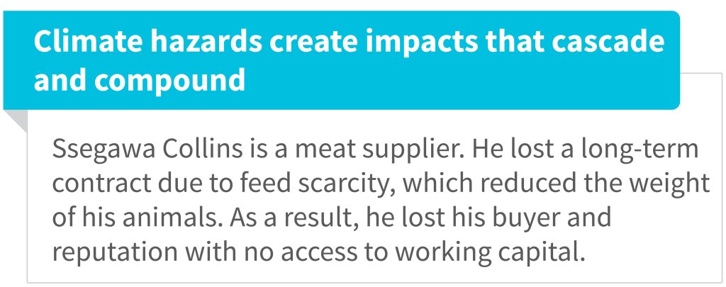 Participants analyze how climate hazards interact with vulnerabilities to create direct and indirect impacts. They trace impacts through value chains, which reveals the ripple effect. Direct impacts include crop failures, storage losses, livestock stunting, and livestock mortality. Meanwhile, indirect impacts include lost contracts, inflated input prices, reduced access to formal and informal credit, and reputational damage.