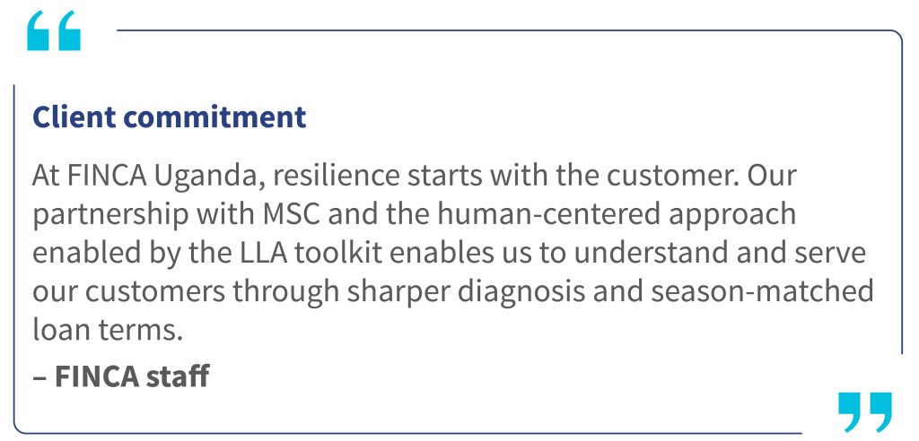 The LLA toolkit helps avoid this trap. It shows lenders how to lend differently and not less. Lenders can align repayment terms with seasonal hazards. They treat adaptation assets, such as boreholes and feed stores, as bankable, and phase credit to manage exposure. Consistent with this toolkit, FINCA Uganda is committed to equip its customers with practical, user-friendly tools and resources to adopt a customer-centric approach in product design and delivery.