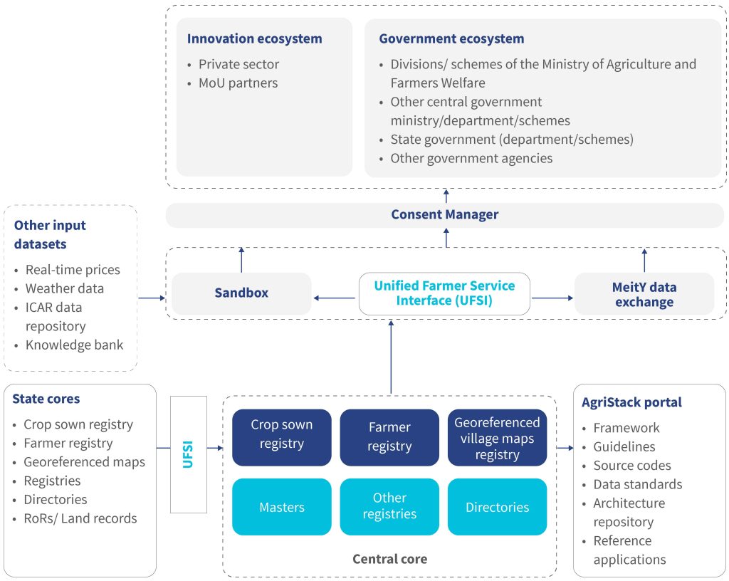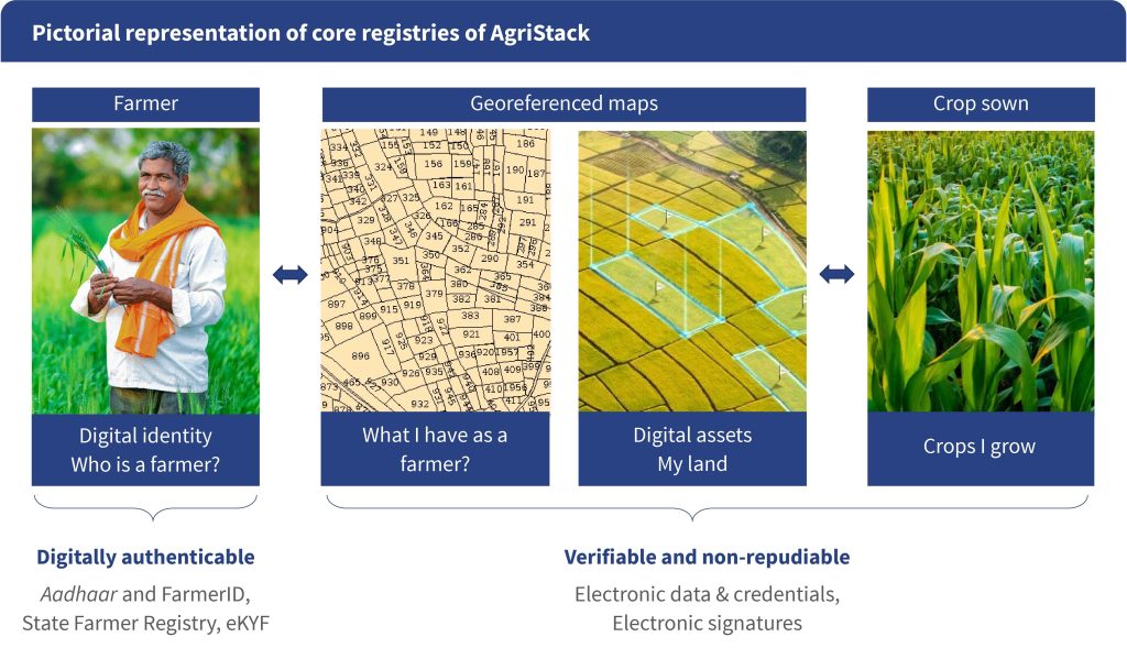 AgriStack is a federated digital public infrastructure (DPI) that comprises registries, datasets, application programming interfaces (APIs), and IT systems. It integrates digital databases and technologies to answer three core questions at the center of most issues that plague the agriculture sector: