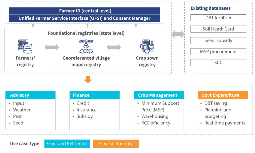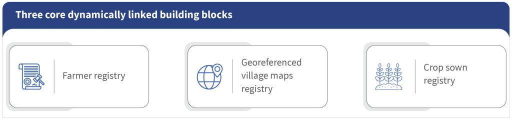 3. Crop-sown registry: The registry records information on various crops that farmers sow every season for all agricultural plots across the country. It maintains a historical plot-level record of crops that farmers plant in each cropping season and creates a comprehensive record of plot-level agricultural activity. It seeks to improve and streamline the previously prevalent paper-based methods of crop survey on a sample basis, as it introduces a smartphone-based digital survey on a census basis.