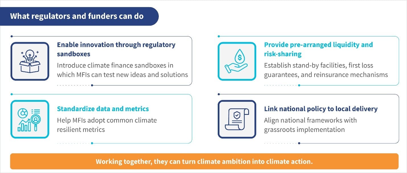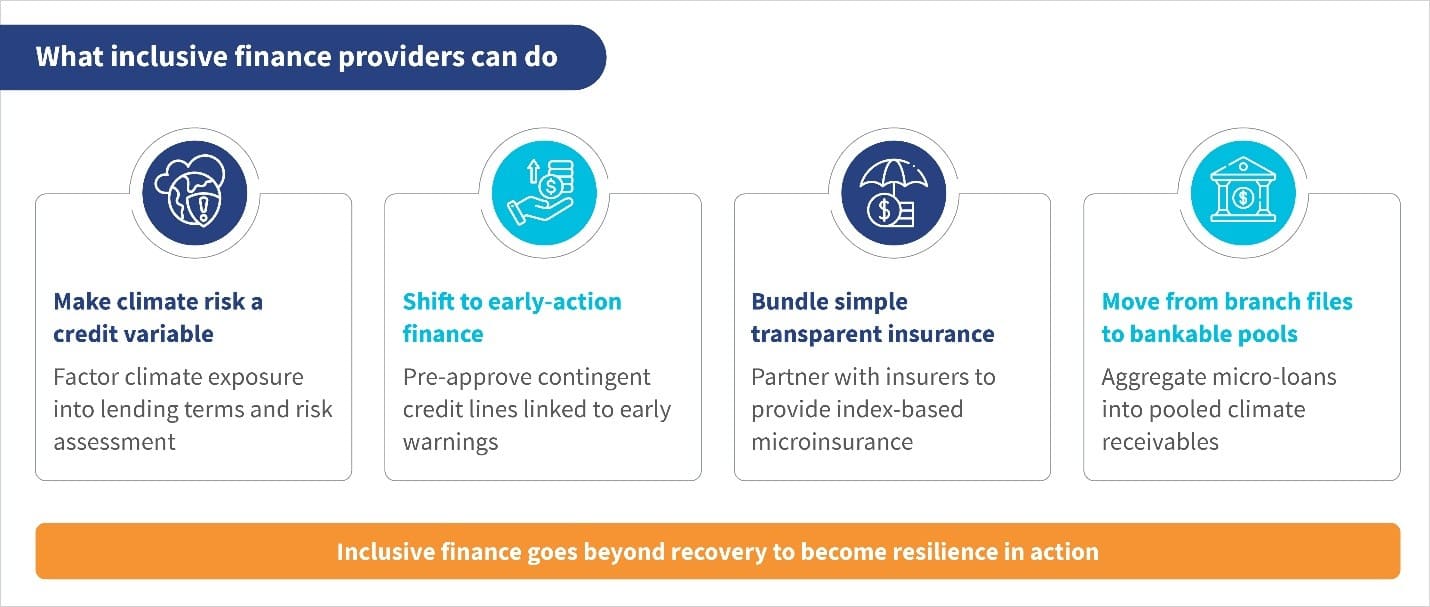 Speedy solutions can make all the difference in moments of crisis. Global initiatives show how risk-sharing and early-action finance can keep institutions afloat during climate shocks. For instance, KfW’s InsuResilience Investment Fund offers a USD 10-million contingent credit line that releases liquidity for MFIs after disasters. The IFC’s Risk Sharing Facility provides first-loss guarantees to de-risk climate lending. The Climate Risk and Early Warning Systems (CREWS) initiative supports early-warning infrastructure that links forecasts to risk-informed financial responses. Such facilities enable MFIs to continue lending even when disaster strikes, which ensures clients are not left waiting for relief.