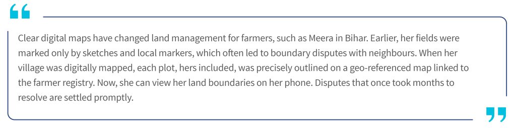 Once these digitized maps are integrated with the state farmer registry, each farmer’s landholding will have a unified spatial-textual identity. This identity combines ownership data from the revenue records with the exact digital boundaries captured through the cadastral maps. This unified record will enable instant verification of land ownership, reduce duplication, and support spatial analysis for planning and governance. Accurate, digital land maps are essential to improve farmer-focused services, such as region-specific crop insurance, customized weather updates, and location-based crop advisories.