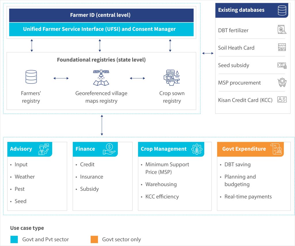 The illustration below shows how the three foundational registries interact within the AgriStack ecosystem to drive this transformation.