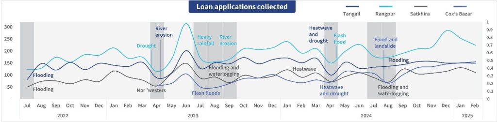 - Loan demand collapses, then rebounds: During disasters, borrowing slows as incomes falter. Once the waters recede or markets reopen, the demand for loans surges. For instance, during April, households grapple with droughts and nor’westers that disrupt agricultural cycles, while in July and August, recurring heavy rainfall and floods frequently damage crops and homes, triggering a spike in loan requests for recovery and rebuilding.