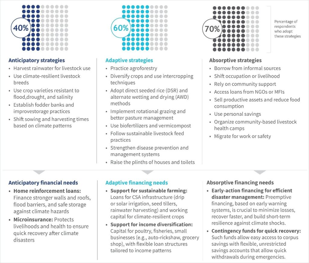 - Savings as the first lifeline: Families withdraw deposits to cover food, health costs, or repairs. Households consume their savings or resort to distress selling of their assets to meet their basic needs during climate events.