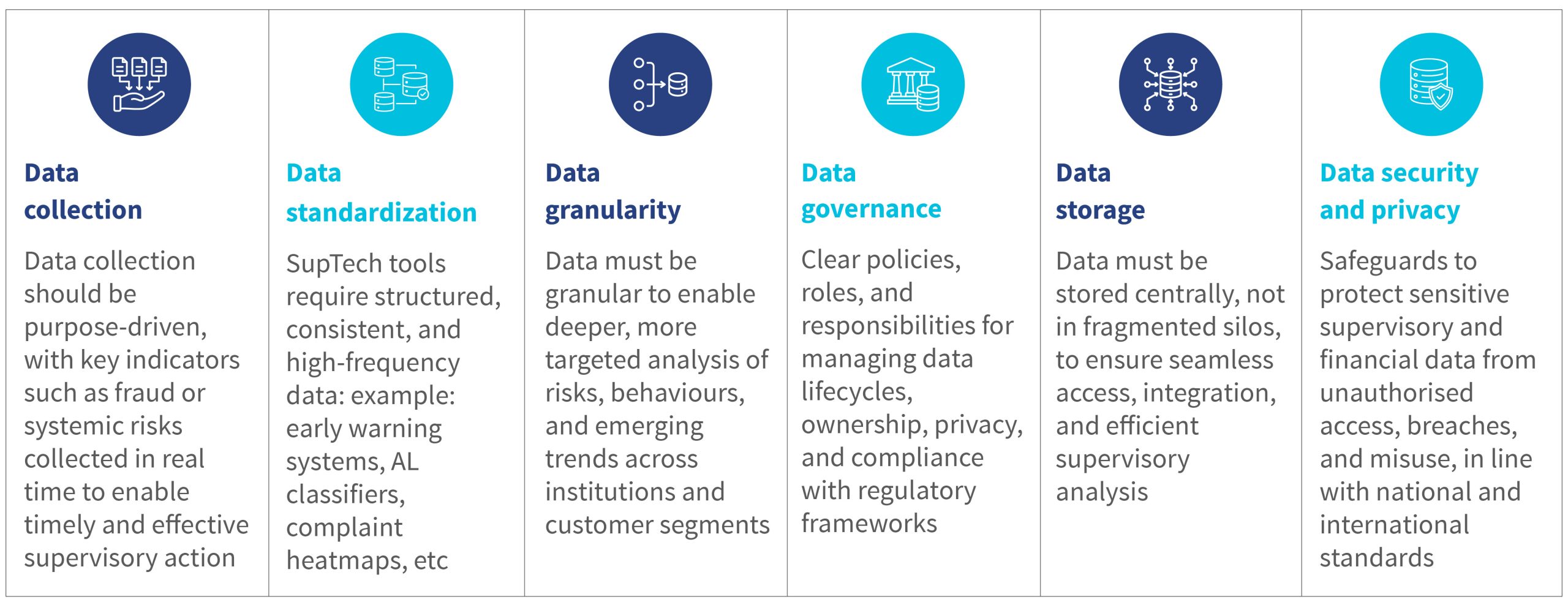If institutions intend to implement SupTech effectively, they must first assess their data maturity on these pillars, identify gaps where they exist, and align their solution with both their current and future needs.