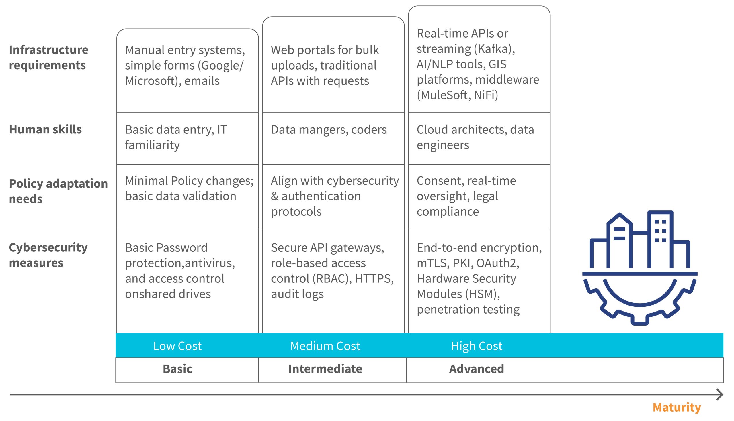 As financial sector supervisors evolve from basic to intermediate and advanced data collection systems, their capabilities must keep pace. At the basic level, data is submitted by regulated entities to regulators manually via tools, such as Google Forms or MS Excel over email, which requires minimal IT skills and basic protection, such as antivirus software and password controls.