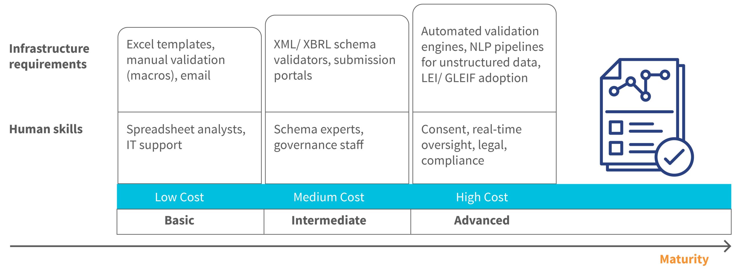 In the intermediate stage, regulators shift to structured formats, such as XML or XBRL, and use schema validators and submission portals to streamline reporting. For example, the Central Bank of Ireland’s ONR platform enables firms to upload XBRL files directly, which improves accuracy and efficiency by involving schema experts and governance teams.