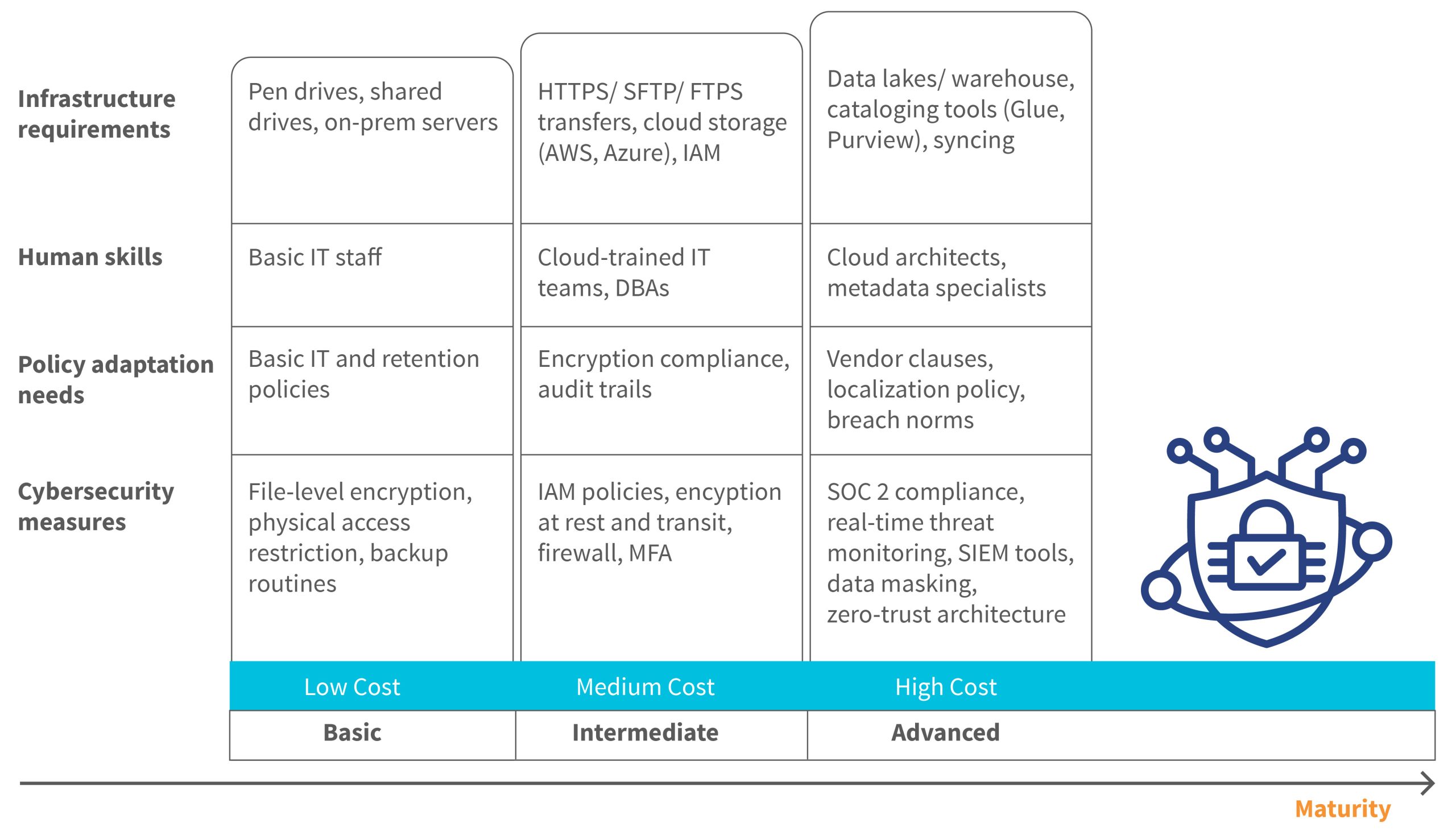 At the basic level, data is stored locally, on USB drives, shared network drives, or on-site servers, which are managed by basic IT staff and protected by simple file encryption, restricted physical access, and regular backups. These setups are low-cost but have limited resilience.