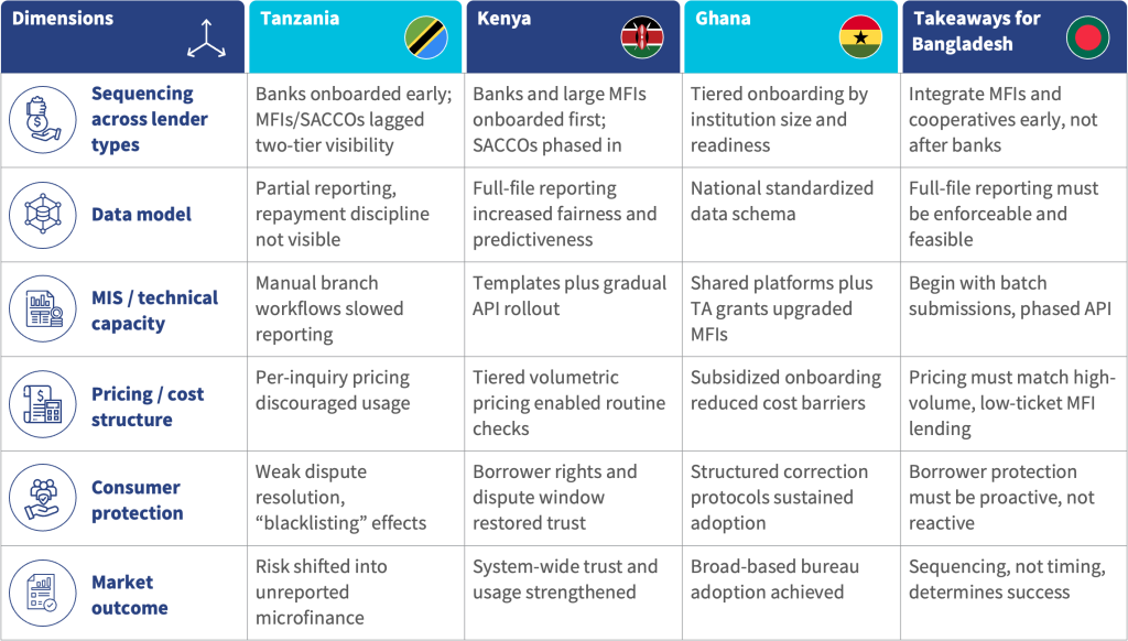 Tanzania and Kenya saw banks adopt bureaus early, but microfinance institutions (MFIs) and savings and credit cooperative organizations (SACCOs) lagged significantly. This gap shifted over-indebtedness problems to unreported segments. Meanwhile, Ghana shows that broad visibility across all lender types is achievable. The country sequenced onboarding by institutional capacity and provided smaller lenders with dedicated technical support.